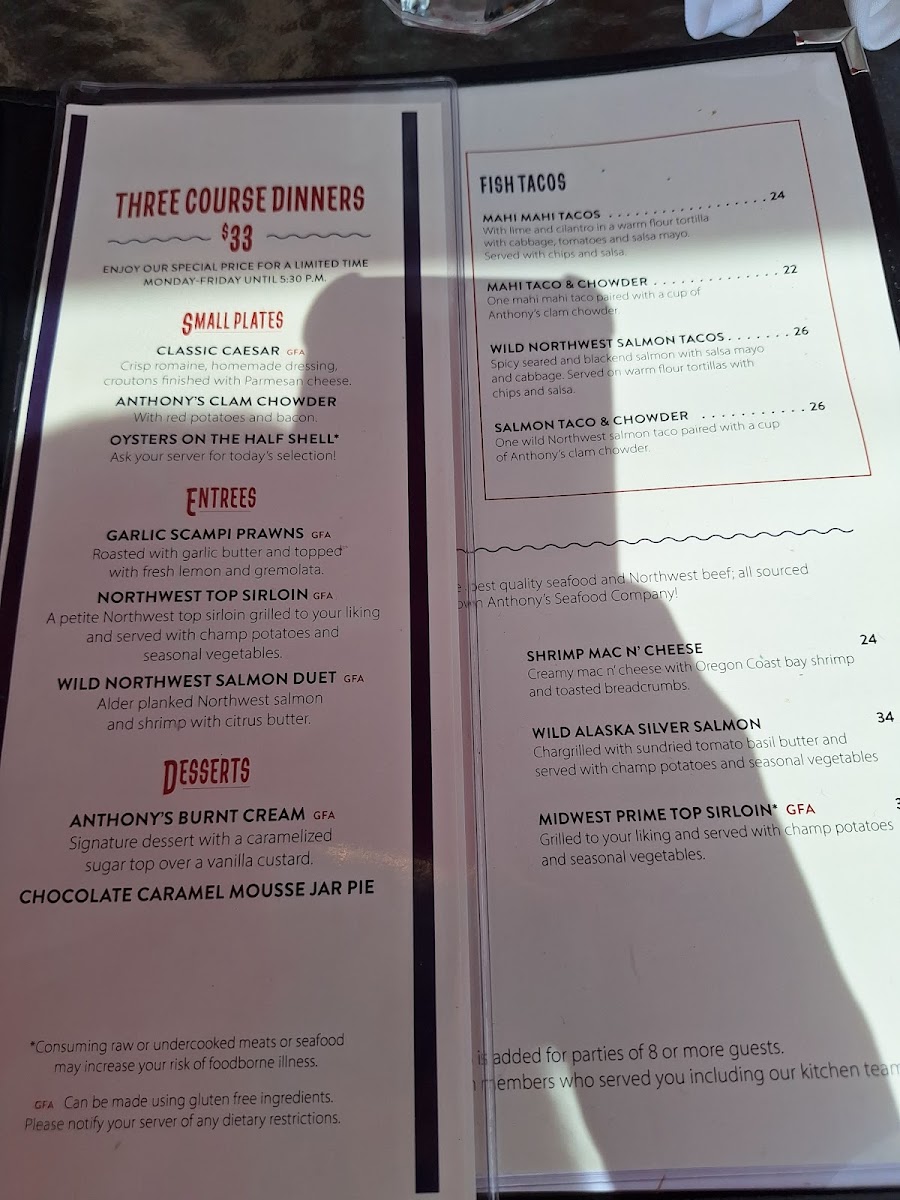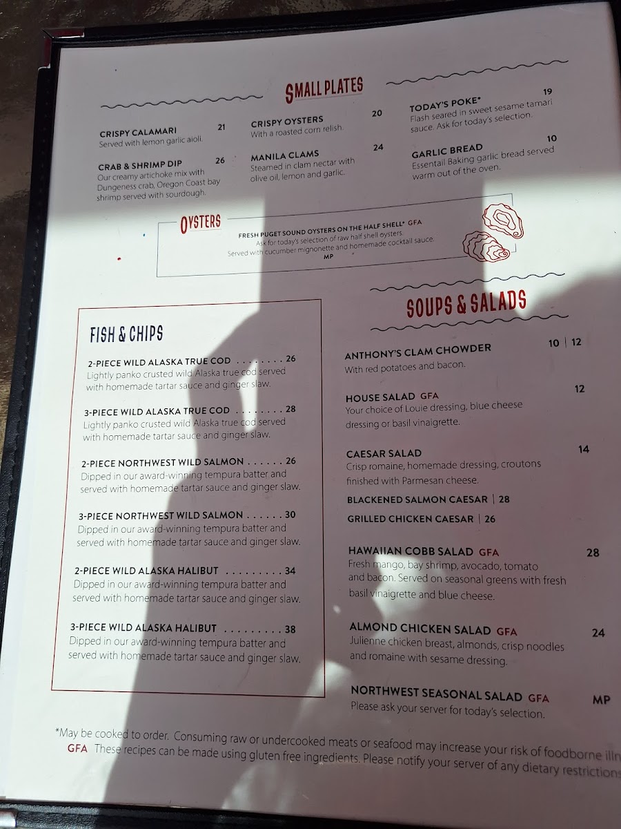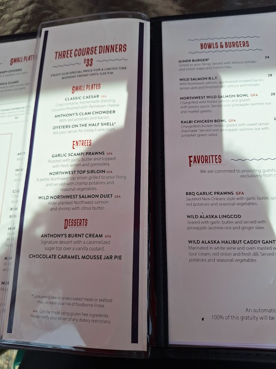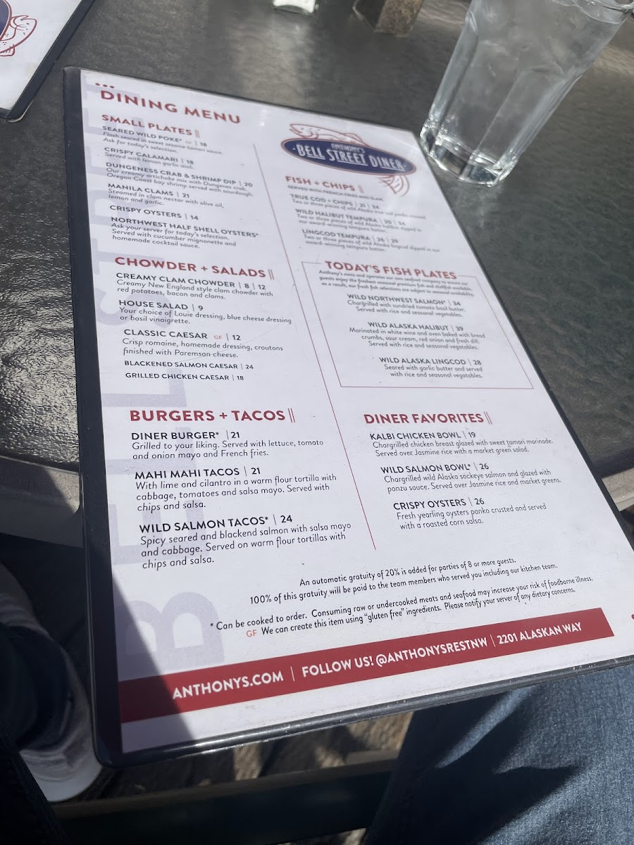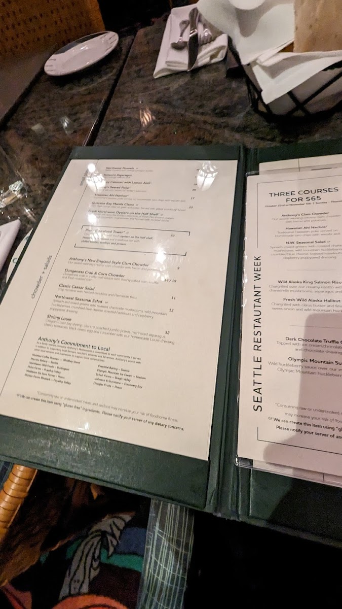 From a reviewer’s perspective, the menu at Anthony's Fish Bar offers a concise yet well-curated snapshot of Pacific Northwest seafood, balancing comfort classics with fresher, lighter options. The chowder selection, including the Cup of Anthony’s Clam Chowder and Anthony’s Baker’s Bowl, sets a familiar and satisfying tone, perfect for starting the meal with rich, coastal flavors. Moving into greens, Anthony’s Cobb Salad provides a hearty alternative that still feels aligned with the restaurant’s seafood-forward identity. The menu also shows thoughtful consideration for families, with kids’ favorites like Crispy Fish & Chips and Chicken Strips & Chips, making the restaurant approachable for all ages. Seafood lovers will find the core of the menu in the fish plates, where standout options such as Wild Alaska Lingcod, Wild Alaska Salmon, and Blackened Rockfish highlight responsibly sourced fish prepared in straightforward, flavor-driven styles. Items like Northwest Oysters and Wild Seared Poke add variety and freshness, appealing to guests looking for something a bit more refined or modern. Finally, the fish & chips section reinforces Anthony’s reputation, featuring crowd-pleasers such as Crispy Panko True Cod, Tempura Prawns, and Lingcod Tempura, each delivering satisfying crunch and classic seaside comfort. Overall, the menu feels cohesive and dependable, clearly focused on quality seafood and familiar preparations, making it an easy recommendation for anyone seeking a reliable taste of the Northwest on Seattle’s waterfront.